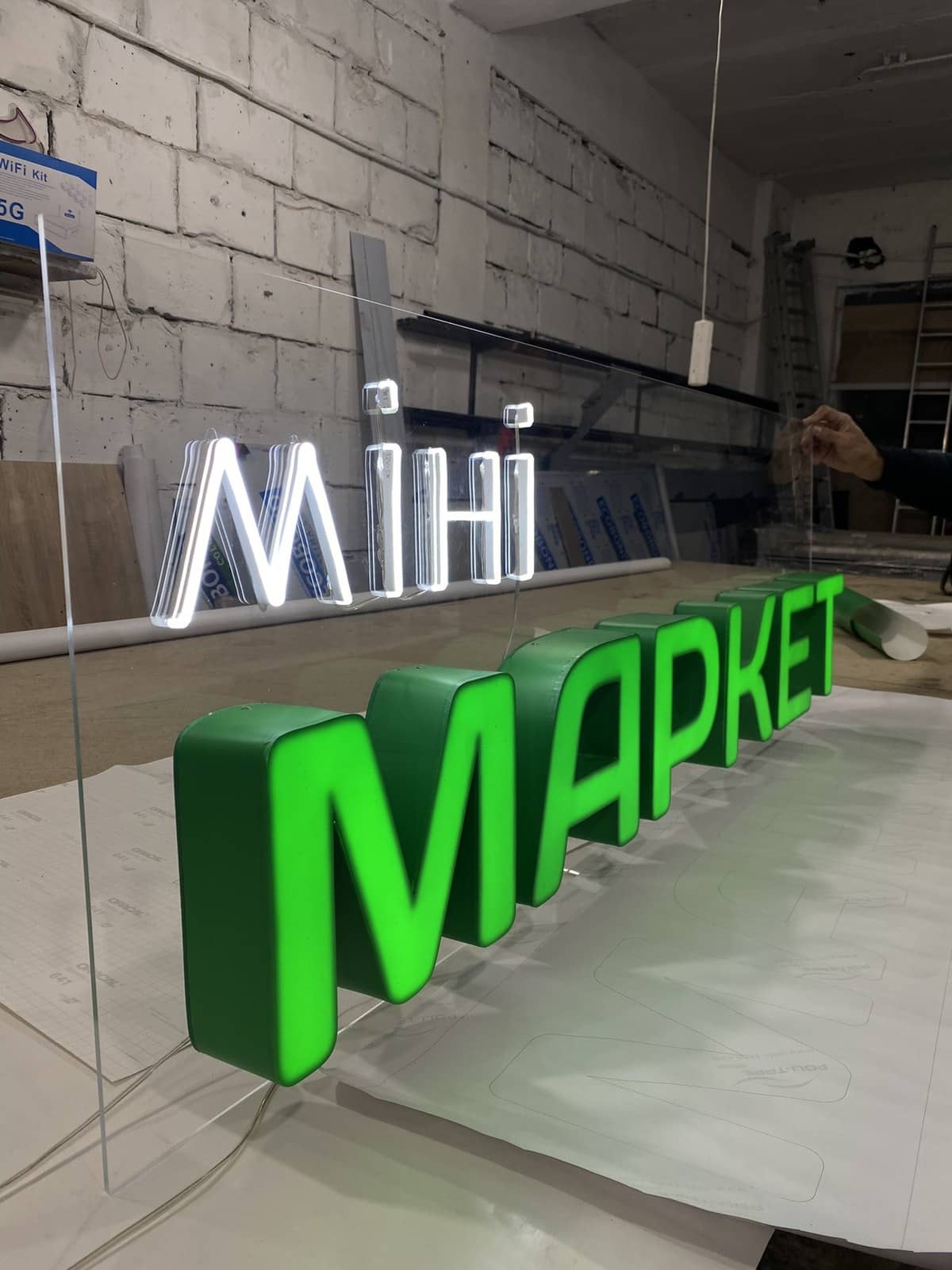 - об’ємні літери – виготовляються з різних матеріалів, обов’язково мають підсвітку в конструкції у вигляді діодів або інших ламп;