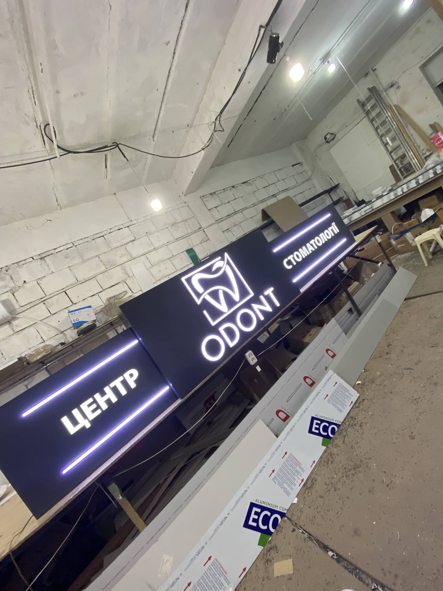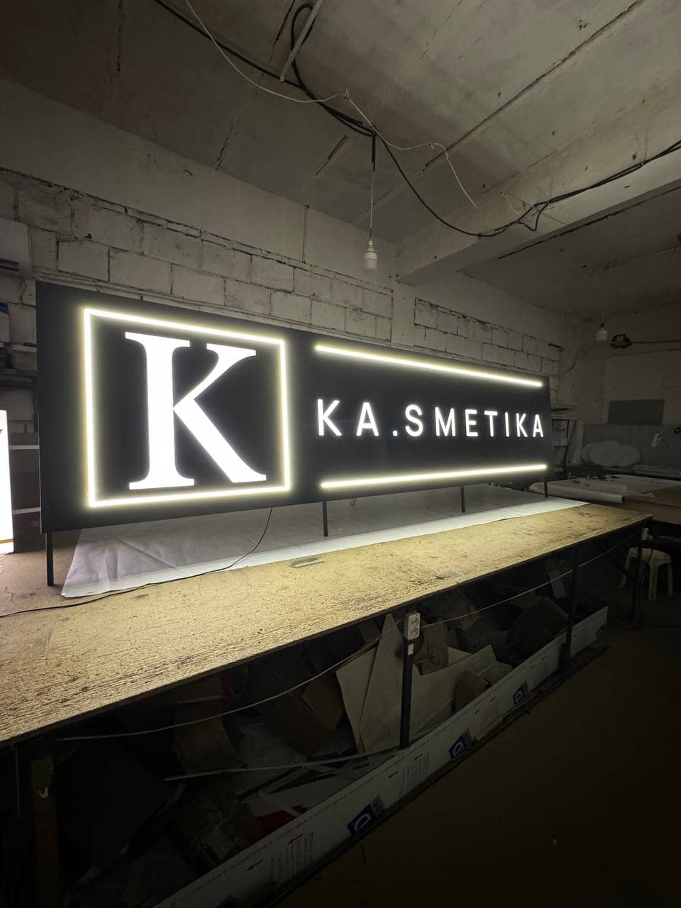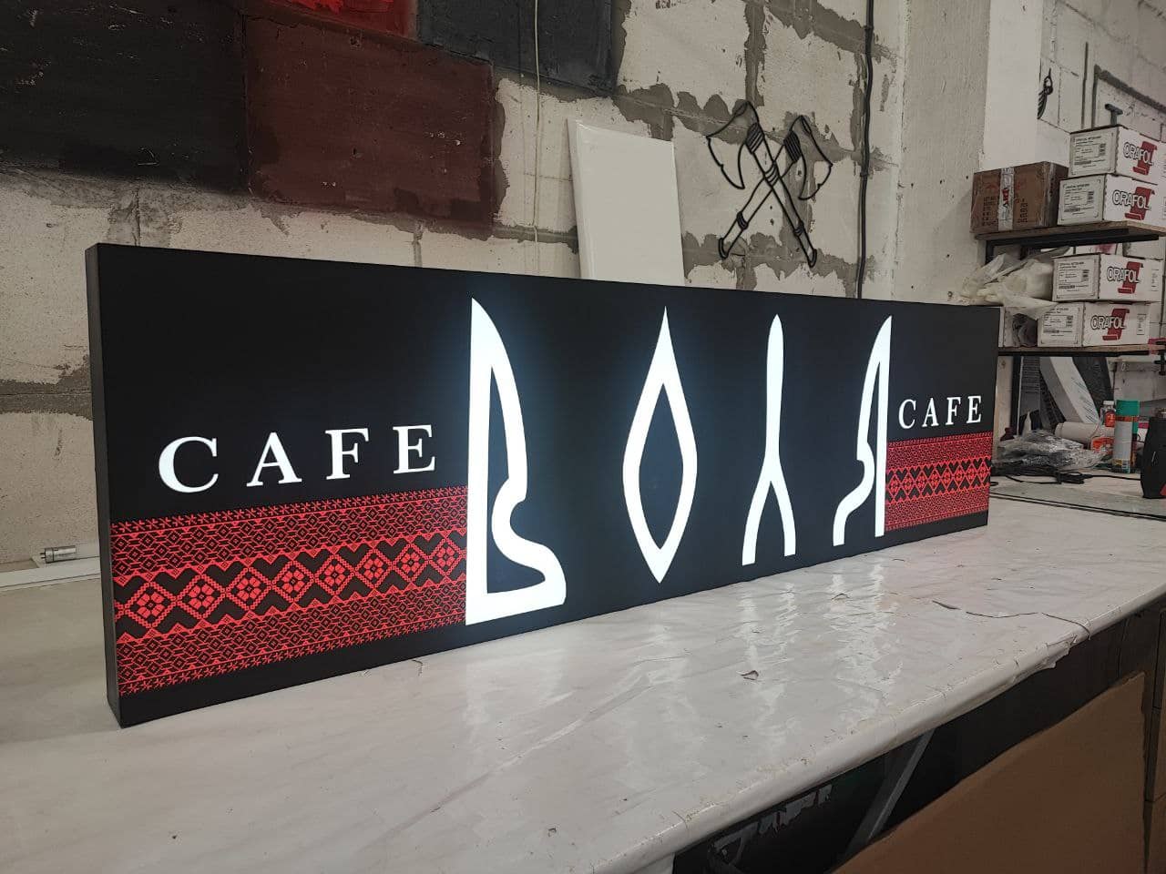 Цей вид вивіски вважається класичним, виготовляючись у конфігурації короба. Найчастіше їх розміщують на вулицях міста та у великих ТЦ. У фронтальній частині вивіски за допомогою лазера чи фрезера робиться потрібне зображення чи напис, а всередині короба ставиться молочний акрил для розсіювання підсвітки. Основний алюмінієвий матеріал не буде пропускати світло, а тому оточуючі бачитимуть лише декоративні елементи зі світлом. Незважаючи на простоту конструкції, такі вивіски мають дуже цікавий та оригінальний вигляд. - Вивіска в рівень композитного матеріалу