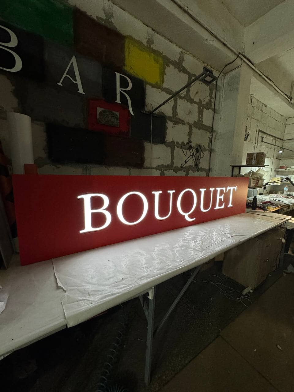 Ця вивіска створює ілюзію оформлення дорогоцінним камінням. Зазвичай у таких виробах більш яскраво підсвічується не фронтальна, а бокова частина, яка дещо виступає над поверхнею композиту. Об’ємність літер регулюється за рахунок товщини акрилу – йото теж піддають фрезеруванню за методом створення невеличкої сходинки. Для інкрустації використовується переважно акрил з діапазоном товщини від 10 до 20 мм.